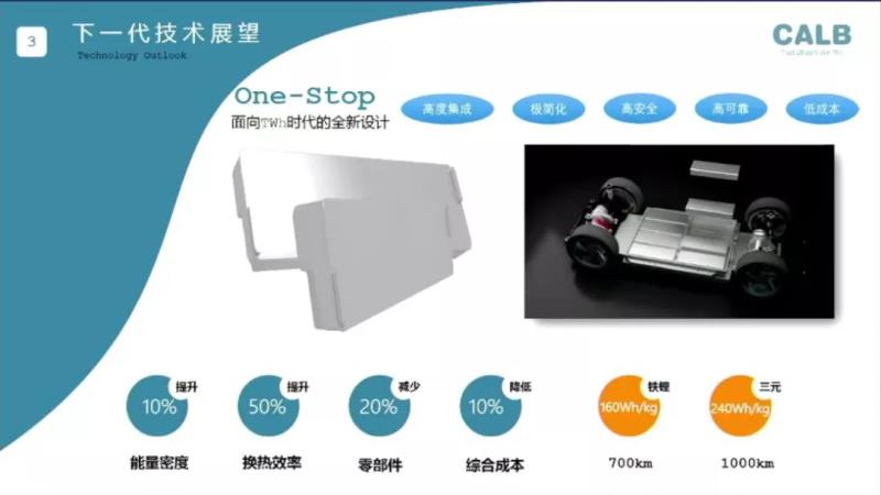 謝秋介紹說,One-Stop可以在體系不變的前提下,能量密度大概能提升10%,包含零部件可以減少20%。在相同的空間內,可以由三元變成鐵鋰,因為體積能量密度更高,鐵鋰支持700公里,電池包的能量密度能做到160Wh/kg;做三元的話,里程能支撐1000公里,電池包的能量密度達到240GWh/kg。