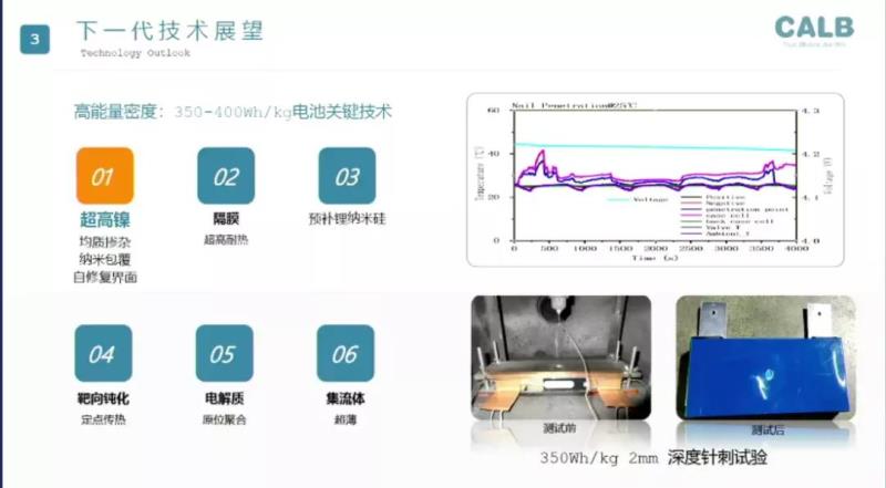 中航鋰電也在開發(fā)9系材料超高鎳材料,以及預補鋰、納米硅等關鍵技術。據(jù)謝秋介紹,中航鋰電現(xiàn)在做出來的成品,按照淺刺的標準,一毫米的鋼針刺兩毫米深度,可以通過試驗,電池包表現(xiàn)為電壓降低。