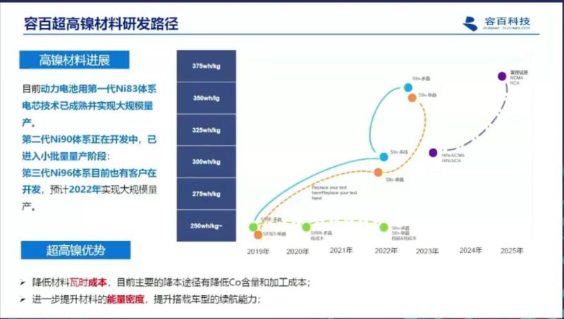 黃學杰提到的第二條降鈷路線是升鎳。為了提高容量,把鎳的容量增加,正極材料的能量可以從160mAh/g提高到180mAh/g,進而繼續(xù)提升到200mAh/g。