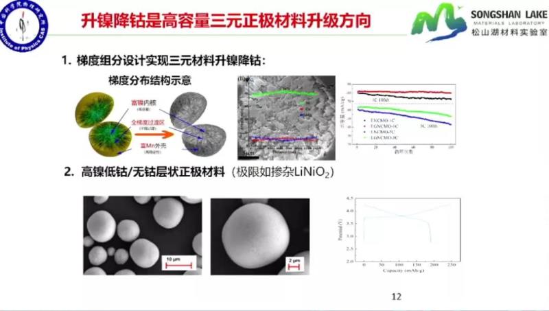 高鎳電池的一大弱點就是壽命和穩(wěn)定性相對較差,為了攻克這一短板,在國家重點研發(fā)專項的支持下,業(yè)內進行梯度材料研發(fā)。例如把鈷完全去掉,做鎳酸鋰電池,路徑是內部摻雜和外部梯度。