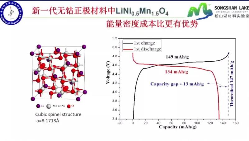 黃學杰認為,降鎳的方向,關鍵的材料是鎳錳酸鋰,第一代材料是錳酸鋰,一樣的結構尖晶石結構,將其中1/4的錳換成鎳后,負極搭配石墨,電壓可以在4.5V以上,“磷酸鐵鋰電池的標準電壓是3.2V,三元電池的標準電壓是3.6V,能大到4.5V,能量密度就有優(yōu)勢?!?