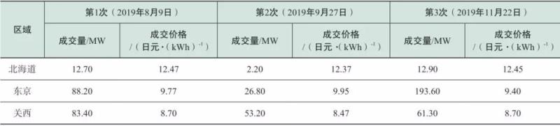如表1所示,2020年日本交割的基荷電力分別于2019年8月、9月和11月進(jìn)行了競(jìng)價(jià)交易,分為北海道、東京和關(guān)西3個(gè)區(qū)域市場(chǎng)進(jìn)行。從交易價(jià)格來(lái)看,基荷電力市場(chǎng)價(jià)格并不低于現(xiàn)貨市場(chǎng)平均價(jià)格(2019年現(xiàn)貨市場(chǎng)均價(jià)7.93日元/kWh),基荷市場(chǎng)并未突顯價(jià)格優(yōu)勢(shì)。從交易量來(lái)看,3個(gè)市場(chǎng)成交量為534.3 MW,相當(dāng)于每年4.68 TWh,僅占新電力公司2019年度全部售電量(129.1 TWh)的3.6%。