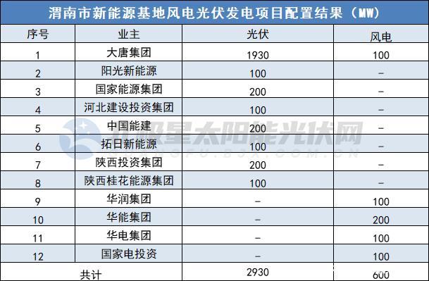 渭南市新能源基地風(fēng)電光伏發(fā)電項目配置結(jié)果公示,確定了排名靠前的13個項目共計150萬千瓦納入渭南市新能源基地(其中風(fēng)電4個共40萬千瓦,光伏8個共100萬千瓦,風(fēng)光互補(bǔ)1個共10萬千瓦)。