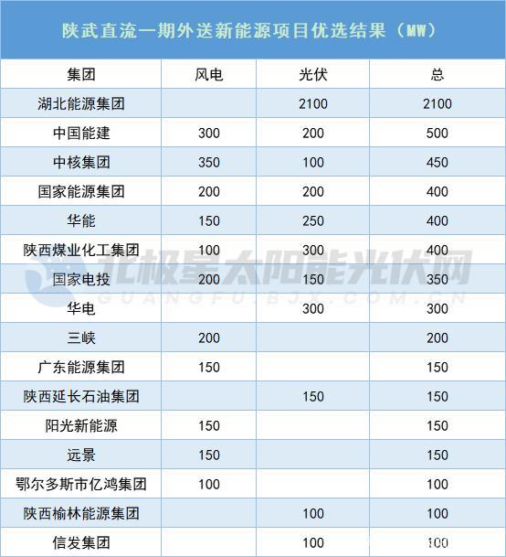 根據(jù)優(yōu)選結(jié)果,除湖北能源集團(tuán)外,確定了32個項目共計3.9GW納入陜武直流一期外送新能源項目。中國能建、中核集團(tuán)、國家能源集團(tuán)、華能、陜西煤業(yè)化工集團(tuán)均獲得400MW+項目。