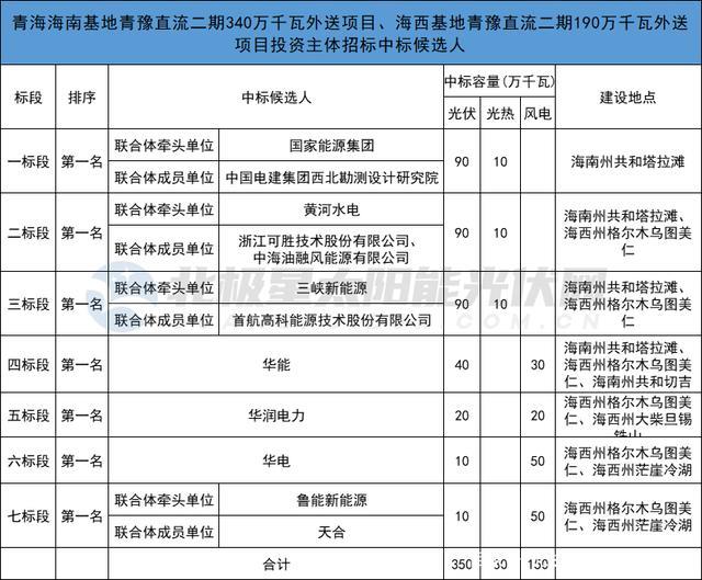 青豫直流二期海南、海西基地外送項目總規(guī)模5.3GW,其中海南基地3.4GW、海西基地1.9GW,共分為7個標(biāo)段,包括3.5GW光伏項目、1.5GW風(fēng)電項目、0.3GW光熱項目。