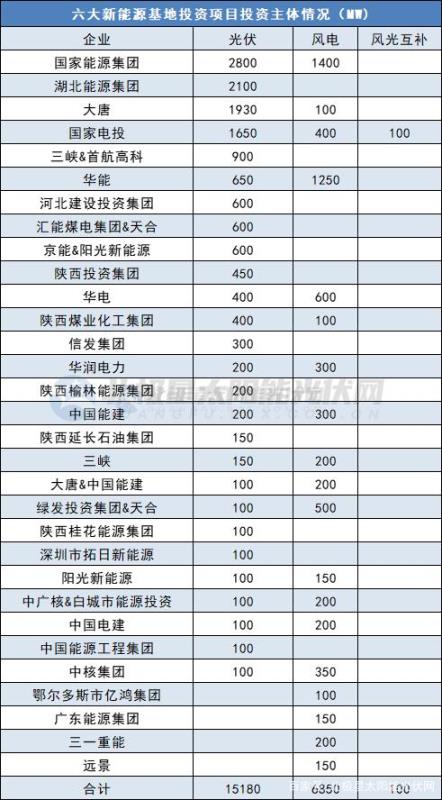 從競爭結(jié)果來看,以上六大基地項目最終敲定了國家能源集團(tuán)、湖北能源集團(tuán)、大唐、國家電投、三峽、華能等33家投資企業(yè)。光伏項目方面,國家能源集團(tuán)、湖北能源集團(tuán)拔得頭籌,所獲規(guī)模均達(dá)2GW以上;大唐、國家電投緊隨其后,所獲規(guī)模均在1.6GW以上。風(fēng)電項目方面,國家能源集團(tuán)、華能斬獲最大,均達(dá)1.2GW以上。