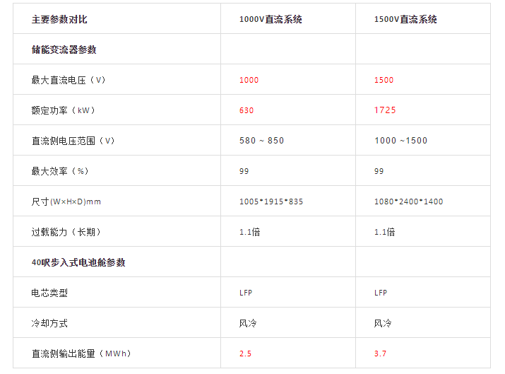 相對常規(guī)1000V直流系統(tǒng),1500V直流系統(tǒng)極大的提升了儲能變流器的功率及電池艙的能量密度。下表針對兩種技術(shù)路線,對主流廠家的儲能變流器和電池艙主要技術(shù)參數(shù)對比。