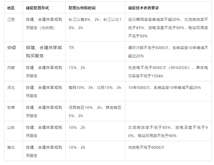 今年以來,各地關(guān)于風(fēng)電、光伏發(fā)電開發(fā)建設(shè)項目配置儲能的方式進行了差異化和細致化的規(guī)定,編者對部分地區(qū)配置儲能相關(guān)文件的梳理,詳見下表。