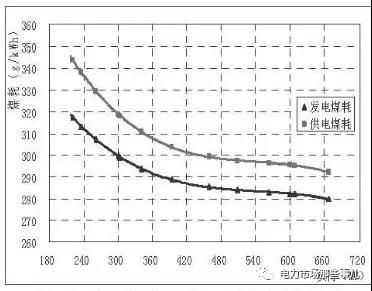煤電機(jī)組進(jìn)行深調(diào)改造,會(huì)帶來(lái)安全性、環(huán)保性、經(jīng)濟(jì)性的問(wèn)題?;痣姍C(jī)組在深調(diào)模式下煤耗增長(zhǎng)5%,靈活性改造每獲得10萬(wàn)千瓦調(diào)峰能力年滾動(dòng)成本約150萬(wàn)元[3]。下圖為660MW機(jī)組在不同負(fù)荷水平下的發(fā)電、供電煤耗曲線(xiàn)[4],在深調(diào)階段(出力從50%降到30%),煤耗增加51克。