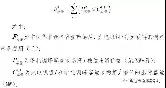 《華北電力調(diào)峰容量市場(chǎng)運(yùn)營(yíng)規(guī)則(暫行)》則是按容量給予火電調(diào)峰機(jī)組回報(bào),華北調(diào)峰容量市場(chǎng)按季度開(kāi)展?;痣姍C(jī)組只要中標(biāo),就可以每天獲取調(diào)峰容量費(fèi)用,具體公式為: