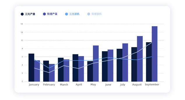 產(chǎn)量方面,9月三元電池產(chǎn)量9.63GWh,占總產(chǎn)量 41.56%;磷酸鐵鋰電池產(chǎn)量 13.51GWh,占總產(chǎn)量58.31%,這是連續(xù)第五個月磷酸鐵鋰電池產(chǎn)量超過三元電池。