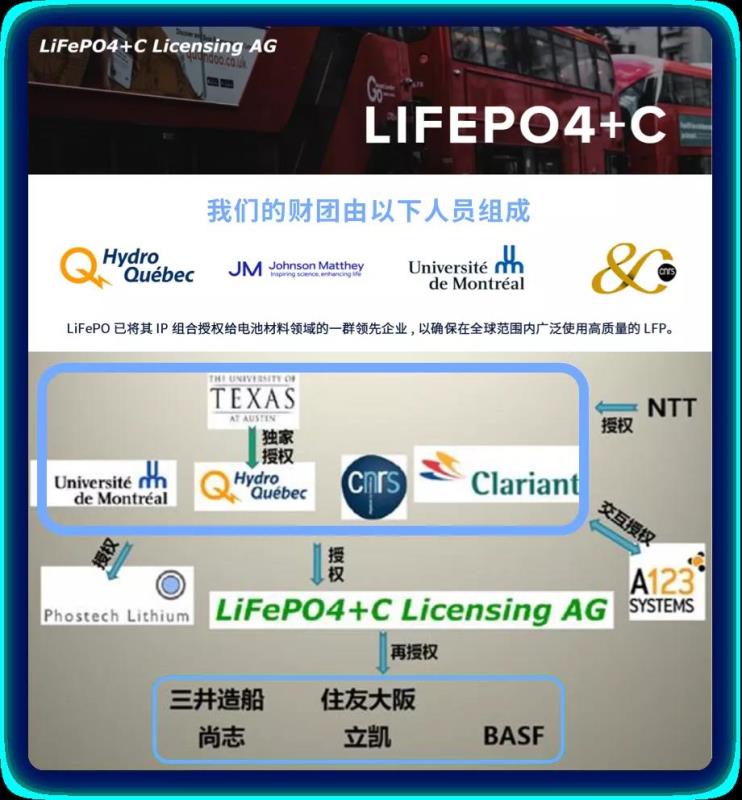 經(jīng)過包碳之后,具有較好的導(dǎo)電性能,讓磷酸鐵鋰電池從實驗室走向市場。德州大學(xué)隨后將磷酸鐵鋰專利獨家授權(quán)給加拿大魁北克公共事業(yè)水力公司(Hydro-Quebec,H-Q),H-Q又將磷酸鐵鋰的獨家商業(yè)授權(quán)給其轉(zhuǎn)投資子公司Phostech Lithium公司。HQ主要具備這兩個磷酸鐵鋰的基礎(chǔ)專利。