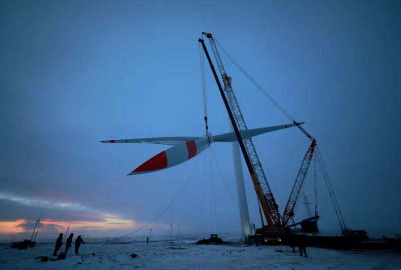 2020年11月27日,國網(wǎng)冀北電力施工人員在 國家風(fēng)光儲輸示范工程(二期)4.5兆瓦風(fēng)機 吊裝現(xiàn)場開展施工作業(yè)。攝影 / 李崢
