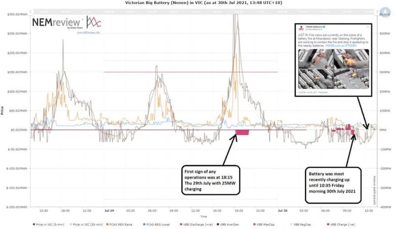 維多利亞儲能項目總裝機容量300MW/450MWh,此前Neoen與澳大利亞能源市場運營商簽訂了一份為期 10 年的合同,主要是提供電力輔助服務(wù)以滿足新南威爾士州和維多利亞州之間的主要電力傳輸?shù)娜萘扛叻逍枨螅媱澯诮衲?2月投運。信息就在火災(zāi)發(fā)生之前的7月29和7月30日早上該項目還進行了一些測試。