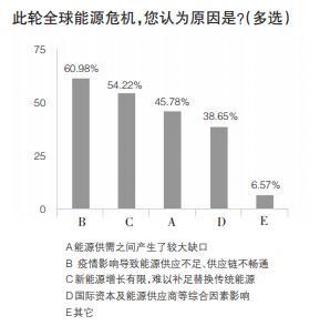 調(diào)查結果顯示,此輪能源危機,244人認為能源供需之間產(chǎn)生了較大缺口,占比45.78%;325人認為疫情影響導致能源供應不足、供應鏈不暢通,占比60.98%;289人認為新能源增長有限,難以補足替換傳統(tǒng)能源,占比54.22%;206人認為受國際資本及能源供應商等綜合因素影響,占比38.65%;35人認為受其他因素影響,占比6.57%。