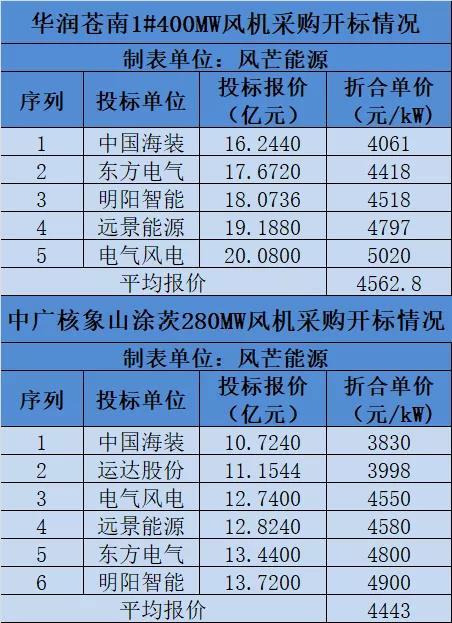 中廣核象山涂茨280MW海上風電項目風機采購共有6家整機商競標,平均投標報價4443元/kW。