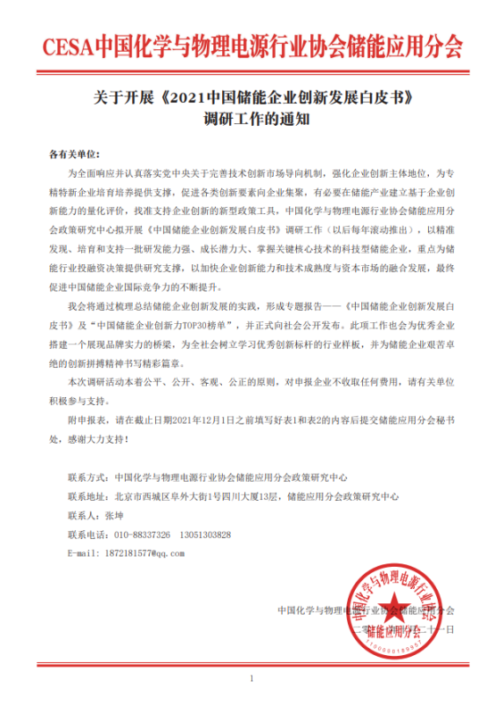 關(guān)于開展《2021中國儲(chǔ)能企業(yè)創(chuàng)新發(fā)展白皮書》調(diào)研工作的通知