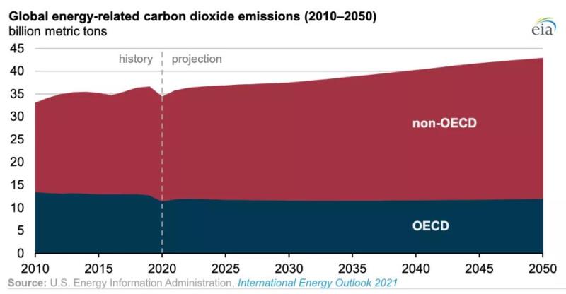 美國(guó)能源信息署(EIA)在剛發(fā)布的《2021年國(guó)際能源展望》(International Energy Outlook 2021)中預(yù)測(cè),根據(jù)現(xiàn)行的政策趨勢(shì),未來(lái)30年全球能源相關(guān)的二氧化碳(CO2)排放量將現(xiàn)在增加。在2020年至2050年期間,預(yù)計(jì)經(jīng)合組織國(guó)家(經(jīng)濟(jì)增長(zhǎng)緩慢的國(guó)家)與能源相關(guān)的二氧化碳排放總量將增加5%(6億噸),非經(jīng)合組織國(guó)家(經(jīng)濟(jì)增長(zhǎng)迅速的國(guó)家)將增加35%(80億噸)。