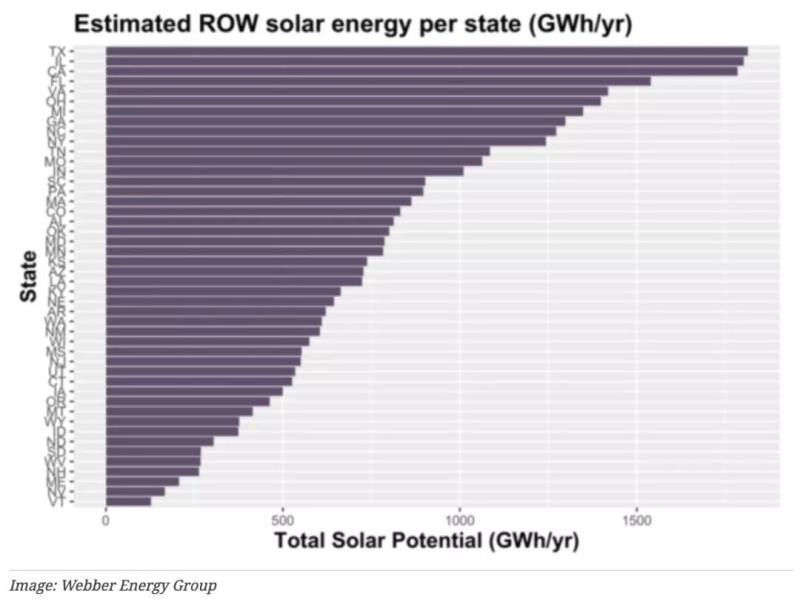 得克薩斯大學(xué)奧斯汀分校韋伯能源集團(tuán)和非盈利組織The Ray與地理信息系統(tǒng)(GIS)測繪公司ESRI的合作,建立了一條公路太陽能光伏潛力評估工具。研究發(fā)現(xiàn),在美國高速公路出口處安裝太陽能電池板每年可以產(chǎn)生高達(dá)36太瓦時(shí)的電能,足以為1200萬輛電動(dòng)乘用車提供動(dòng)力,估計(jì)每年的能源價(jià)值為40億美元。