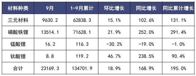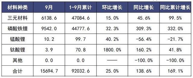 從裝車量來看,9月,三元鋰電池裝車6.1GWh,同比上升45.6%;磷酸鐵鋰電池裝車9.5GWh,同比上升309.3%。1-9月,三元電池裝車量累計47.1GWh, 占比51.2%,同比累計上升99.5%;磷酸鐵鋰電池裝車量累計44.8GWh, 占比48.7%,同比累計上升332.0%。