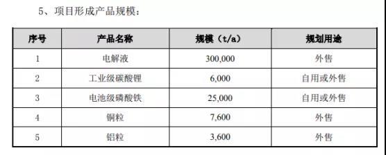項(xiàng)目總投資15.33億元,選址四川省眉山市彭山經(jīng)開(kāi)區(qū),建設(shè)周期18個(gè)月,投產(chǎn)擬形成30萬(wàn)噸電解液、6000噸工業(yè)級(jí)碳酸鋰、2.5萬(wàn)噸電池級(jí)磷酸鐵、7600噸銅粒及3600噸鋁粒。