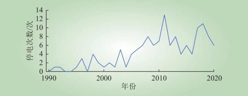 圖1 1990—2020年歷年大停電次數(shù)