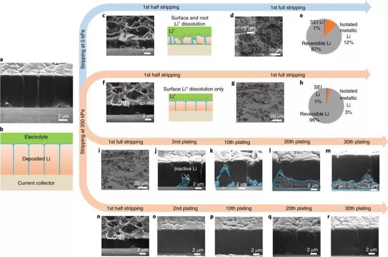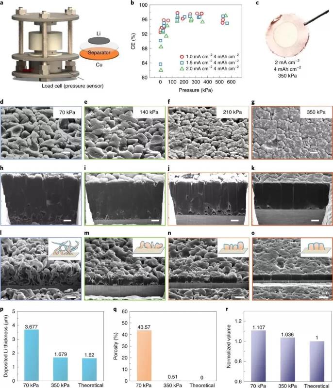 實(shí)驗(yàn)很簡(jiǎn)單,首先在不同壓力下進(jìn)行鋰金屬電化學(xué)沉積,實(shí)際上這對(duì)應(yīng)的是電池中的充電過(guò)程,接著再對(duì)這些沉積的鋰金屬樣品進(jìn)行橫截面形貌分析。然后她發(fā)現(xiàn),在壓力一步步優(yōu)化的過(guò)程中,鋰金屬在電化學(xué)沉積過(guò)程中的生長(zhǎng)方向,可以被壓力改變,借此可在最優(yōu)條件下形成完美、且致密的柱狀結(jié)構(gòu)。最優(yōu)壓力大約為350 kPa,這遠(yuǎn)遠(yuǎn)小于鋰金屬244 MPa的屈服強(qiáng)度,這表明鋰金屬并不是在壓力作用下發(fā)生的變形,也意味著只需三到四個(gè)大氣壓壓力,即可在工業(yè)上有效控制鋰金屬的致密生長(zhǎng)。