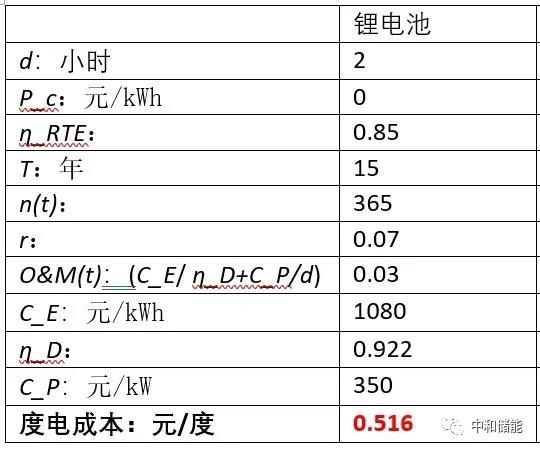 使用以上公式,我們對一個鋰電池儲能系統(tǒng)進(jìn)行度電成本計算。各參數(shù)如下圖所示,假設(shè)該系統(tǒng)用于發(fā)電側(cè)每天循環(huán)一次,即使使用15年,全壽命度電成本依然高達(dá)0.516元/度。由此,不難想象為什么目前發(fā)電側(cè)依然沒有太大的動力來積極主動建設(shè)儲能系統(tǒng)了。