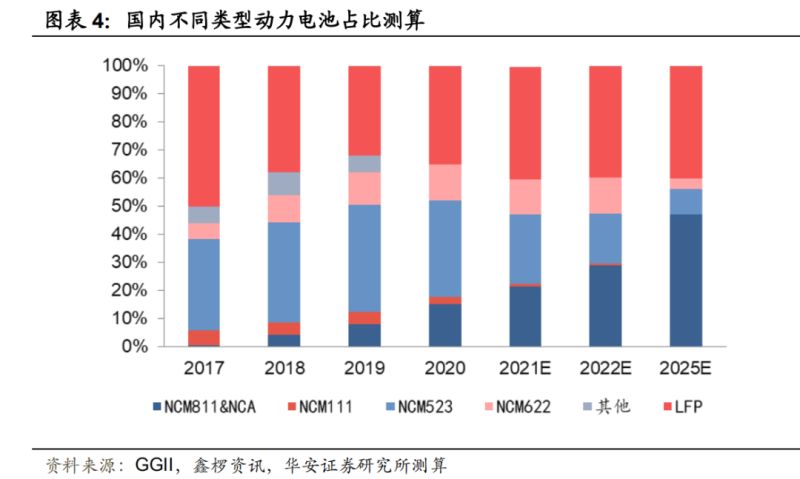 按照材料成本不同,NCM三元電池可以分為111、523、622、811等若干種。其中,NCM811是鈷占比最低的產(chǎn)品,寧德時代已經(jīng)于2019年實現(xiàn)量產(chǎn)。
