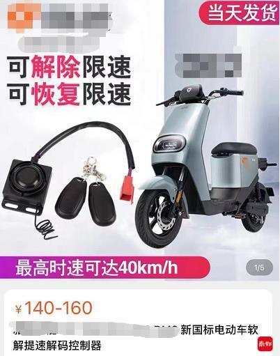記者還發(fā)現(xiàn),電商平臺上還售有電動自行車“控制器”,更換后即可實現(xiàn)對新國標(biāo)車的提速。如,一網(wǎng)店售有國標(biāo)電動車“控制器”,價格為100多元。商家的商品詳情宣稱,“提速效果能到35-45碼之間(GPS測速)”,“購買前請對照下自己原車插頭接口,一致的即插即用,帶超速功能,比原廠解碼解除限速的控制器更快?!?