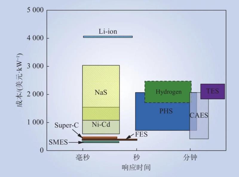 圖3為常見(jiàn)ESS的響應(yīng)時(shí)間與投資成本比較。由圖3可知,SMES、FES和Super-C的單位投資成本低于其他儲(chǔ)能技術(shù),鑒于它們的快速響應(yīng)時(shí)間,通常用于短期能量?jī)?chǔ)存[5, 22]。在已開(kāi)發(fā)的技術(shù)中,SMES的單位投資成本最低,響應(yīng)時(shí)間最短[22-24]。電池儲(chǔ)能單位成本相對(duì)較高。氫儲(chǔ)能系統(tǒng)投資成本適中,為1500~2400美元/kW[25]。響應(yīng)時(shí)間在可接受的分鐘級(jí)范圍內(nèi),其系統(tǒng)成本及響應(yīng)時(shí)間同樣受氫價(jià)值鏈中采用不同技術(shù)路徑的影響。