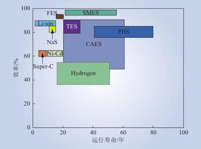 圖2為常見(jiàn)ESS的系統(tǒng)效率和運(yùn)行壽命比較。ESS循環(huán)效率最高的是SMES,它將電流儲(chǔ)存在由電流流過(guò)超導(dǎo)線圈產(chǎn)生的磁場(chǎng)中,由于超導(dǎo)線圈沒(méi)有電阻,損耗幾乎為零,僅有附屬電力設(shè)備如交流/直流轉(zhuǎn)換器造成的2%~3%的損耗[22]。FES和Li-ion的系統(tǒng)效率也較高。ESS的能量損耗主要來(lái)源于不同組件之間的能量傳遞過(guò)程,通過(guò)調(diào)節(jié)充電和放電過(guò)程中的能量損耗,可以提高ESS的效率。機(jī)械儲(chǔ)能方式中PHS和CAES的使用壽命最長(zhǎng),分別為40~80年和25~60年。電池儲(chǔ)能系統(tǒng)隨著工作時(shí)間的延長(zhǎng),電池的化學(xué)性能變差,使用壽命相對(duì)較短,大多低于20年。氫儲(chǔ)能系統(tǒng)的循環(huán)效率為35%~55%[20, 23],低于常規(guī)ESS,其主要受氫價(jià)值鏈中采用不同技術(shù)路徑的影響,如汽車(chē)中氫燃料電池效率約為60%,而通過(guò)內(nèi)燃機(jī)的效率約為20%,綜合考慮氫能的價(jià)值鏈,氫儲(chǔ)能的壽命為15~50年[24]。