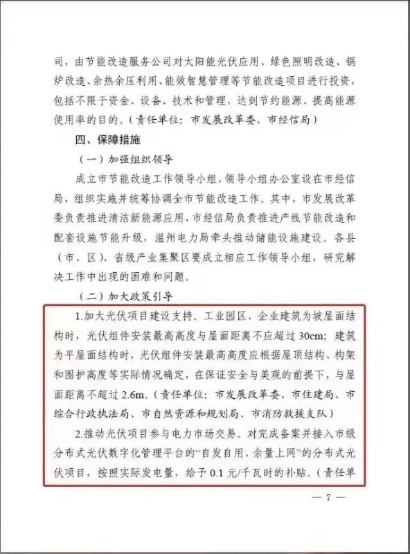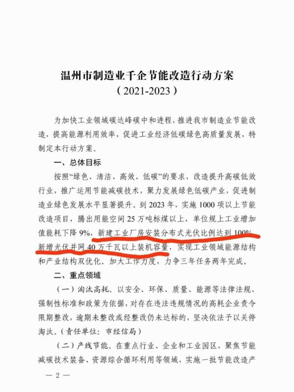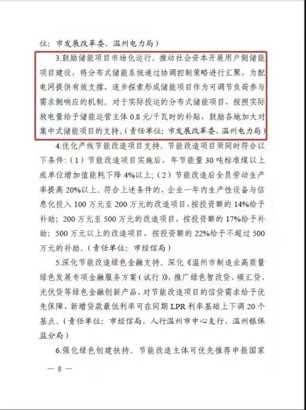 10月25日,溫州市人民政府辦公室發(fā)布《溫州市制造業(yè)千企節(jié)能改造行動方案(2021-2023)》,方案指出,新建工業(yè)廠房安裝分布式光伏比例達(dá)到100%以上。推動社會資本開展用戶側(cè)儲能項(xiàng)目建設(shè),將對于實(shí)際投運(yùn)的分布式儲能項(xiàng)目,按照實(shí)際放電量給予儲能運(yùn)營主體0.8元/千瓦時(shí)的補(bǔ)貼,鼓勵各地加大對集中式儲能項(xiàng)目的支持。