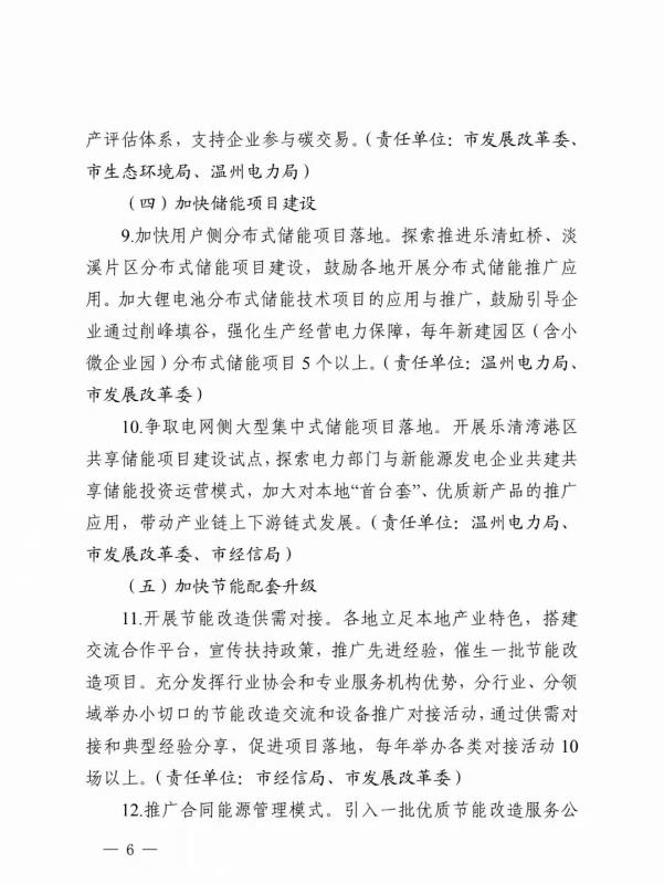 加快用戶側(cè)分布式儲能項(xiàng)目落地。探索推進(jìn)樂清虹橋、淡溪片區(qū)分布式儲能項(xiàng)目建設(shè),鼓勵各地開展分布式儲能推廣應(yīng)用。加大鋰電池分布式儲能技術(shù)項(xiàng)目的應(yīng)用與推廣,鼓勵引導(dǎo)企業(yè)通過削峰填谷,強(qiáng)化生產(chǎn)經(jīng)營電力保障,每年新建園區(qū)(含小微企業(yè)園)分布式儲能項(xiàng)目5個以上。