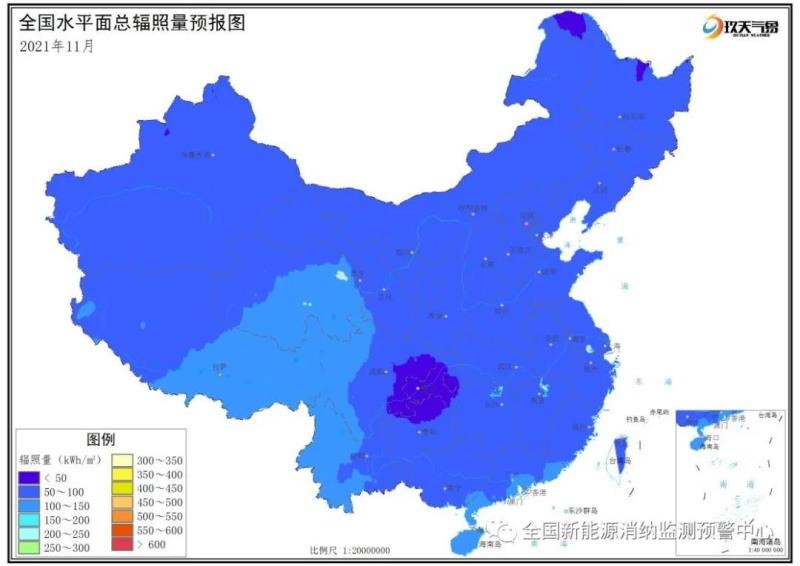 附圖4 全國(guó)2021年11月水平面總輻照量預(yù)報(bào)圖