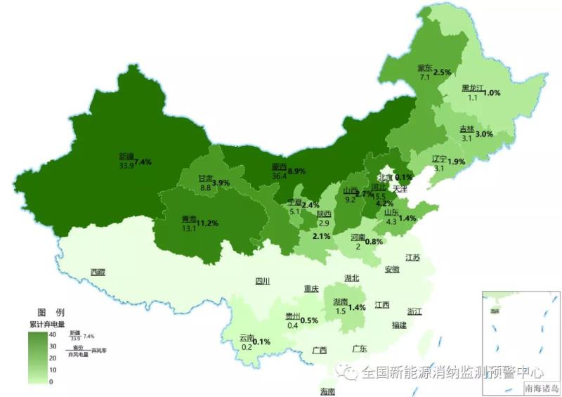 截至9月底各地區(qū)累計(jì)棄風(fēng)電量(億千瓦時(shí))及棄風(fēng)率
