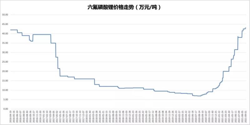 均價(jià)從7萬(wàn)元/噸一路飆漲到近45萬(wàn)元/噸,六氟磷酸鋰(LiPF6,下稱六氟)僅用時(shí)一年。