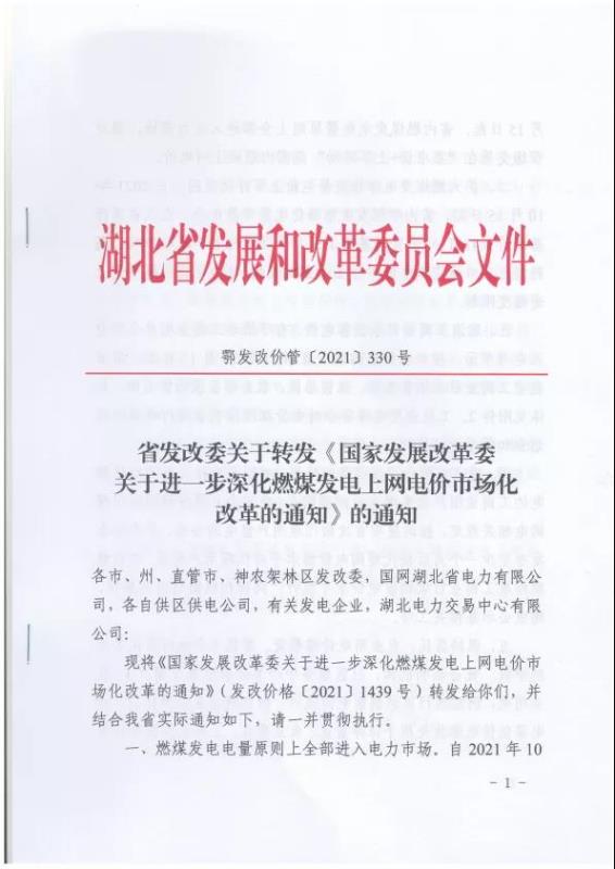 湖北:關(guān)于轉(zhuǎn)發(fā)《國家發(fā)展改革委關(guān)于進(jìn)一步深化燃煤發(fā)電上網(wǎng)電價(jià)市場化改革的通知》的通知