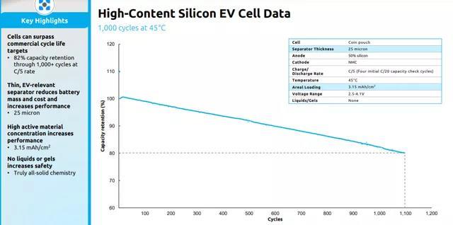 20層的小軟包電池在45°下的循環(huán)次數(shù)(C/5)超過 1,000 次循環(huán)( 80% 容量保持率),從數(shù)據(jù)來看,這個比QS的進度要更好一些。