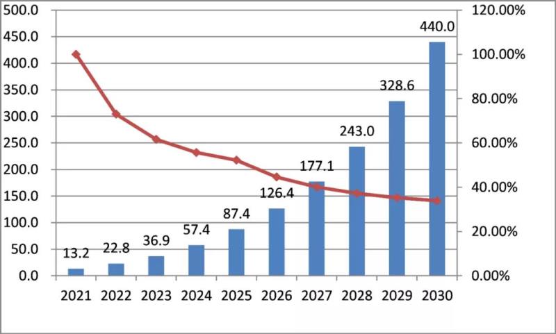 不論是電網(wǎng)保供電還是新能源消納,電力系統(tǒng)都更加需要大規(guī)模、長(zhǎng)周期、易調(diào)度的新型儲(chǔ)能電站,以實(shí)現(xiàn)日內(nèi)充分調(diào)節(jié)以及特殊情況下跨日、跨月調(diào)節(jié),僅從日內(nèi)調(diào)節(jié)來(lái)說(shuō),參照抽水蓄能,一般配置4小時(shí)以上的調(diào)節(jié)能力,那么新型儲(chǔ)能的調(diào)節(jié)能力也至少達(dá)到4小時(shí)以上?!蛾P(guān)于鼓勵(lì)可再生能源發(fā)電企業(yè)自建或購(gòu)買(mǎi)調(diào)峰能力增加并網(wǎng)規(guī)模的通知》(發(fā)改運(yùn)行〔2021〕1138號(hào))中,也提出了配置4小時(shí)左右的指引,較長(zhǎng)時(shí)長(zhǎng)儲(chǔ)能將是未來(lái)的發(fā)展方向。考慮新型儲(chǔ)能配置逐步從當(dāng)前比較普遍的2小時(shí)上升至4小時(shí),預(yù)計(jì)2030年新型儲(chǔ)能總?cè)萘繉⒊^(guò)440GWh以上。新型儲(chǔ)能總?cè)萘看笾纶厔?shì)如圖1,紅色曲線為總?cè)萘吭鏊佟!笆奈濉逼陂g總?cè)萘坑?0倍以上增長(zhǎng)空間,“十五五”期間總?cè)萘咳源嬖?倍以上增長(zhǎng)空間。