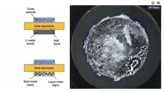 為了提供相似的液體-固體界面,該研究團(tuán)隊(duì)開發(fā)了一個(gè)半固體電極,放置于鋰金屬陽(yáng)極與固體電解質(zhì)材料之間。這個(gè)半固體電極提供了一個(gè)可以自愈的表層,同時(shí)也有助于防止脆性電解質(zhì)表面出現(xiàn)微小裂紋,從而為樹突生長(zhǎng)提供場(chǎng)所。半固體電極的材料是由鈉和鉀組成的,與牙醫(yī)用來(lái)填補(bǔ)蛀洞的固體金屬混合物相似,但仍然能夠流動(dòng)和成形。