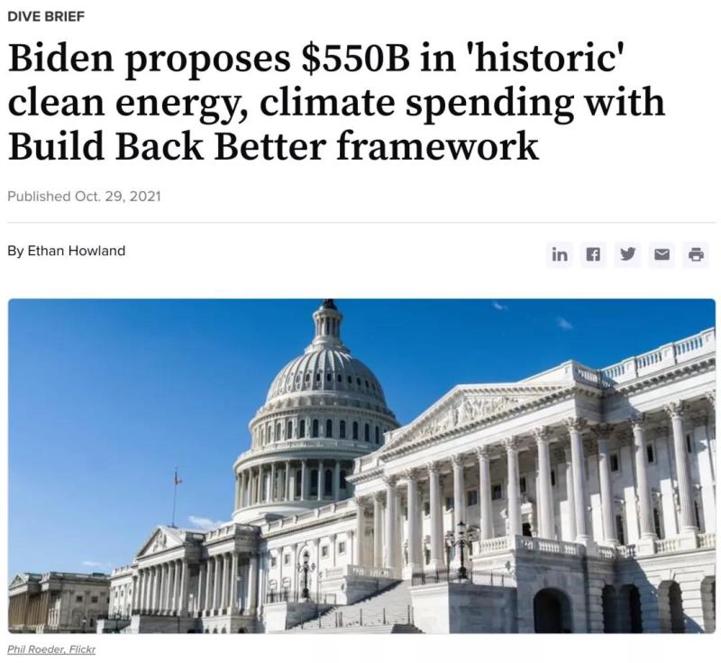 拜登向美國國會(huì)提出1.85萬億美元“重建更好”預(yù)算框架(The Build Back Better Framework),包括在10年內(nèi)撥款5500億美元用于清潔能源和氣候項(xiàng)目,預(yù)計(jì)到2030年可將溫室氣體排放量減少10億噸以上。