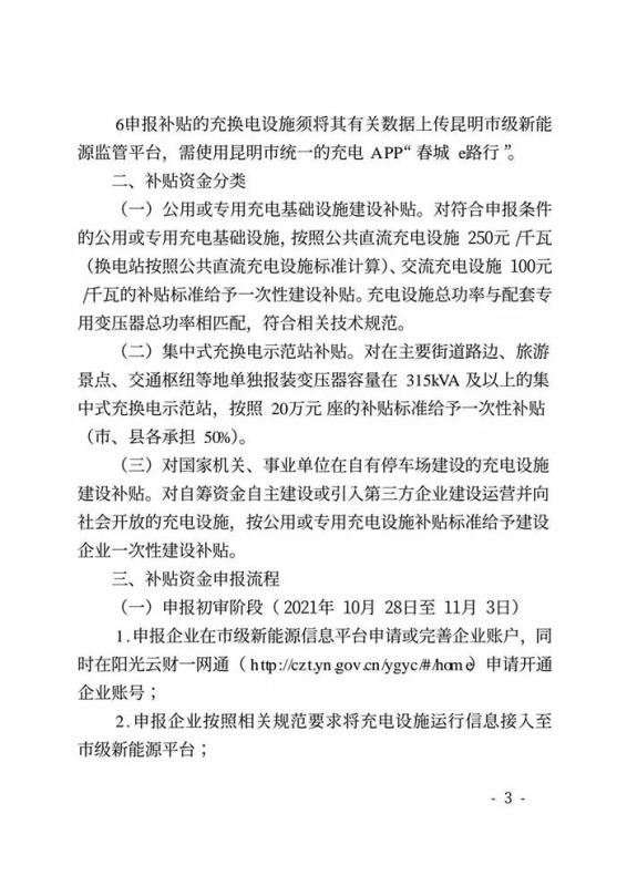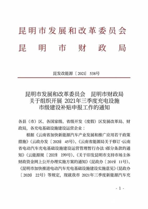近日,昆明市發(fā)展和改革委員會、昆明市財(cái)政局發(fā)布《關(guān)于組織開展2021年三季度充電設(shè)施市級建設(shè)補(bǔ)貼申報(bào)工作的通知》(以下簡稱“通知”)。通知指出,昆明市2021年三季度新能源汽車充電設(shè)施市級建設(shè)補(bǔ)貼申報(bào)對象為:1.在昆明市發(fā)展和改革委員會進(jìn)行過充電基礎(chǔ)設(shè)施建設(shè)運(yùn)營登記的企業(yè);2.其他符合申報(bào)充電基礎(chǔ)設(shè)施獎(jiǎng)勵(lì)和補(bǔ)貼條件的單位或企業(yè)。