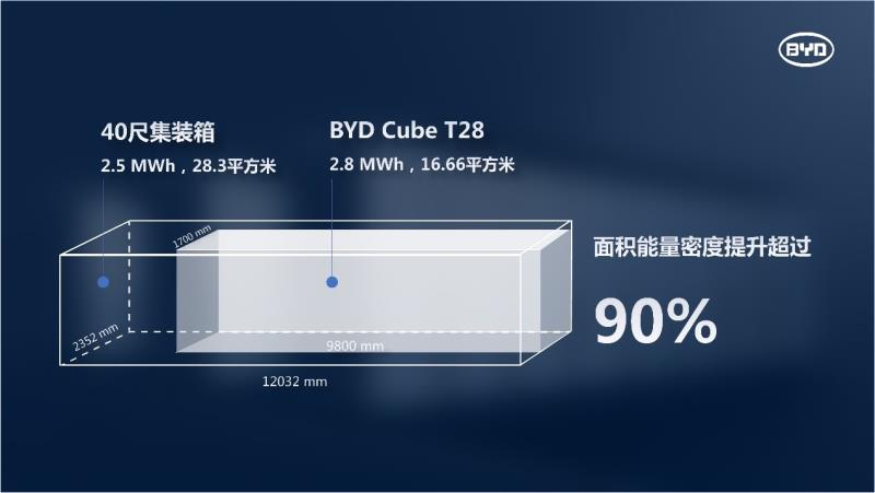 BYD Cube T28儲能系統(tǒng)。比亞迪全新一代電網(wǎng)級儲能產(chǎn)品BYD Cube T28,占地僅16.66平方米儲能容量2.8MWh,相較于行業(yè)內(nèi)40尺標(biāo)準(zhǔn)集裝儲能系統(tǒng)單位面積能量密度提升了超90%,率先支持1500V直流電壓,匹配不同品牌的高電壓換流器。