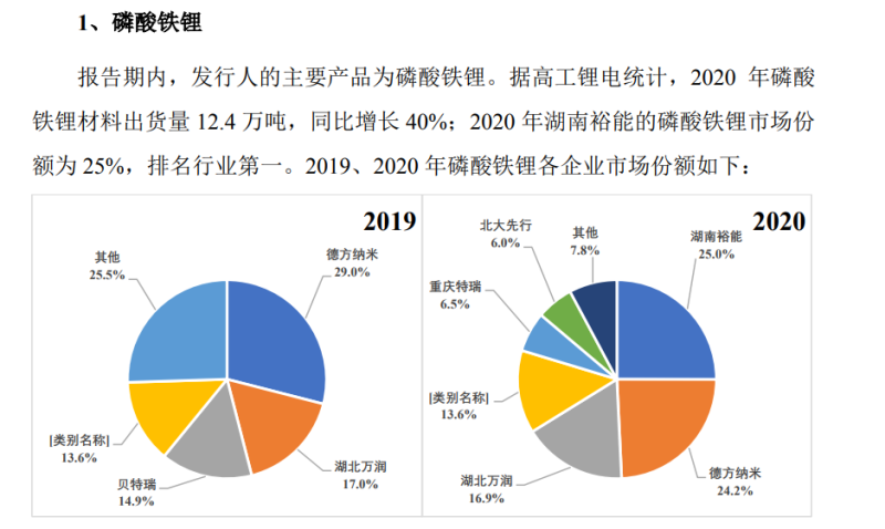 根據(jù)湖南裕能招股書(申報(bào)稿,下同)顯示,公司2020年在國(guó)內(nèi)磷酸鐵鋰正極材料領(lǐng)域的市場(chǎng)占有率為25%,磷酸鐵鋰出貨量排名第一。按出貨量計(jì)算,湖南裕能實(shí)為磷酸鐵鋰“一哥”。