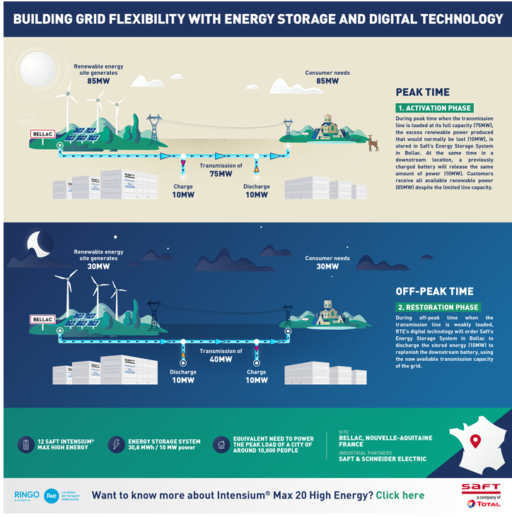在通常情況下,電網(wǎng)運(yùn)營商可以通過調(diào)峰來管理峰值電力需求。在這種模式下,電池儲(chǔ)能系統(tǒng)將在電力充足、市場(chǎng)價(jià)格較低時(shí)儲(chǔ)存能量,并在電力需求回升且價(jià)格更高時(shí)提供電力。RTE公司是一家受監(jiān)管的公用事業(yè)公司,其使命是用戶提供更好的電力服務(wù)。因此能不會(huì)通過影響能源的價(jià)格或可用性來干擾電力市場(chǎng)。RTE公司并不是簡單地進(jìn)行調(diào)峰,而是為RINGO儲(chǔ)能項(xiàng)目開發(fā)了一個(gè)新概念,其中在法國各地運(yùn)營的儲(chǔ)能系統(tǒng)將同時(shí)存儲(chǔ)和釋放能量。這確保了可再生能源得到充分利用——換句話說,避免了限電措施;還將克服輸電基礎(chǔ)設(shè)施中可能存在的瓶頸,而不會(huì)隨時(shí)影響電網(wǎng)上的凈電量。在RINGO儲(chǔ)能項(xiàng)目的早期階段,儲(chǔ)能系統(tǒng)提供商Saft公司就儲(chǔ)能系統(tǒng)的功能及其在電網(wǎng)中的作用向RTE公司提供了建議。其目標(biāo)是幫助RTE公司評(píng)估一種在技術(shù)和經(jīng)濟(jì)上可行的先進(jìn)的電池儲(chǔ)能解決方案。