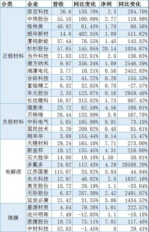 電解液(含六氟磷酸鋰、溶劑相關(guān)企業(yè))領(lǐng)域,六氟磷酸鋰作為價(jià)格走勢(shì)強(qiáng)勁的材料之一,多氟多、天際股份、永太科技、延安必康4家企業(yè)獲益凈利潤(rùn)爆發(fā)式增長(zhǎng),漲幅均在14倍以上,其中多氟多凈利潤(rùn)增速高達(dá)205.8倍。