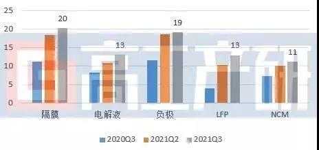 但在負(fù)極材料、三元正極、鋰鹽、隔膜等多領(lǐng)域,盈利能力較Q2明顯放緩,其中負(fù)極石墨化Q3產(chǎn)能釋放不及預(yù)期,加工費(fèi)走高,負(fù)極材料成本壓力加劇,企業(yè)盈利能力明顯放緩。