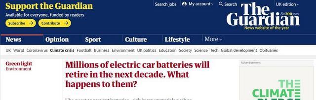 英國《衛(wèi)報》報道截圖 據(jù)估計,至2030年,預(yù)計將有超過1200萬噸鋰離子電池“退休”。這些電池生產(chǎn)需要大量的鋰、鎳和鈷等原材料,這些原材料的開采會對氣候、環(huán)境以及勞工權(quán)利產(chǎn)生影響,同時,當(dāng)這些電池超過使用壽命,還可能變成堆積如山的電子垃圾。
