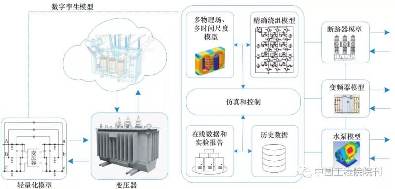 大型泵站設(shè)備用于抽提水資源,是一個(gè)融合電氣、信息和控制的綜合系統(tǒng),涉及的子系統(tǒng)包括變電系統(tǒng)、水泵系統(tǒng)、監(jiān)控系統(tǒng)等?;跀?shù)字孿生的泵站設(shè)備運(yùn)行平臺(tái),采用數(shù)字孿生的“數(shù)據(jù)鏈”技術(shù),建立多種部件耦合的多物理場(chǎng)、多尺度數(shù)字孿生仿真模型;利用數(shù)字孿生泵站可視化管理系統(tǒng),實(shí)現(xiàn)虛擬環(huán)境中的仿真與現(xiàn)實(shí)的運(yùn)維無縫銜接,提高企業(yè)管理與運(yùn)維的透明化程度。以變電設(shè)備為例(見圖 4),構(gòu)建電、磁、熱耦合的多物理場(chǎng)和考慮多時(shí)間尺度的數(shù)字孿生仿真模型,為大型泵站的設(shè)備選型和系統(tǒng)運(yùn)行提供精細(xì)化模型。